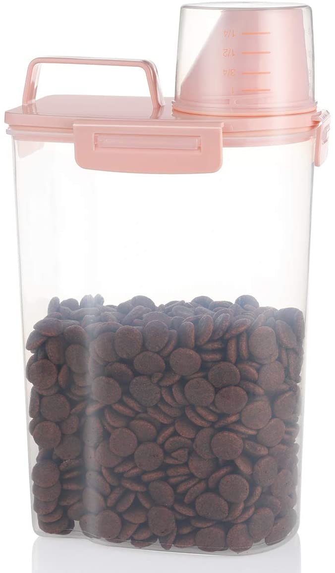 Yicostar Pet Food Storage Container, Airtight Small Dog Food Container Cat Food Container with Measuring Cup, Upgraded Large Pour Spout and 4 Seal Buckles Food Dispenser for Pets Food and Birds Seed